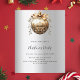 An invitation for a Christmas Party. A faux silver looking background. Decorated with a large golde vintage looking bauble. Personalise and add the details. Black text.