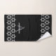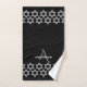 Personalise this black and silver monogram Netilat Yadayim hand towel for the ritual washing of the hands as a gift for Purim, Passover or any holiday or special occasion. The black background features a double row of faux silver glitter Star of David symbols along both short edges. Your optional monogram initial in a soft silvery grey decorative font is overlaid with your name, also optional, in crisp white and simple block letters on one edge of the hand towel. For your own family, as keepsakes or as unique special gifts, these personalised ritual Netilat Yadayim towels with the faux silver glitter Magen David motif will make a beautiful presentation.