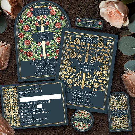 Celebrate your special day with these royal medieval sword wedding RSVP cards against a gray background. You can customize this further by clicking on the "PERSONALIZE" button. PLEASE NOTE: The silver on the back of this item is NOT real foil and is printed in flat colors