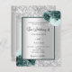 Faux silver looking background decorated with green florals, flowers and faux silver glitter, sparkles. Personalise and add your names and wedding details. Black letters.