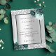 Faux silver looking background decorated with green florals, flowers and faux silver confetti. Personalise and add your names and wedding details. Black letters.