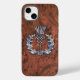 A silver chrome like Scottish thistle over a mahogany wood grain print decor on a custom high end phone case. Sounds good, a great gift idea.
