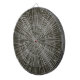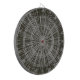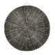 A painting of silver grey spokes in circular patterns, on black, cover this dart board. Follow the spokes and aim for the centre.