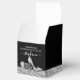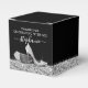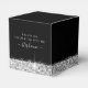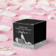 Elegant personalised square party favour box with silver glitter high heel stiletto shoes and a silver faux glitter border with confetti sprinkles on a black background with custom thank you text, perfect for a modern and chic birthday, bat mitzvah, Quinceañera, bridal shower, baby shower or bachelorette party. USE THE DESIGN TEMPLATE EDITOR to change the fonts, colours and layout to create a fun and unique personalised favour box for your party guests guests.