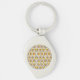 "Silver keychain with a circular, multicolored floral pattern, shown on a white background. Another view displays it next to keys, a notebook, and a smartphone on a light wooden surface, with orange flowers and green foliage nearby."