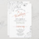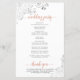 These wedding programs are elegant and tasteful, while still being budget friendly. The design features ornate silver grey faux foil lace with terracotta or coral orange and grey text on a white background. The typography features lacy script calligraphy, and there is room for details on the ceremony, the bridal party, and a short thank you.