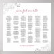 This beautiful wedding seating chart features dusty rose and grey text on a white background with seating assignments for 200-240 guests. It features a simple yet stylish and elegant design with ornate decorative faux foil silver filigree in the corners. The title is written in fancy script calligraphy and reads: Please find your table.