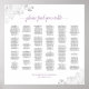 This beautiful wedding seating chart features dusty purple or lavender and grey text on a white background with seating assignments for 200-240 guests. It features a simple yet stylish and elegant design with ornate decorative faux foil silver filigree in the corners. The title is written in fancy script calligraphy and reads: Please find your table.
