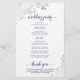 These wedding programs are elegant and tasteful, while still being budget friendly. The design features ornate silver grey faux foil lace with navy blue text on a white background. The typography features lacy script calligraphy, and there is room for details on the ceremony, the bridal party, and a short thank you.