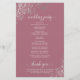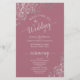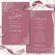 These wedding programs are elegant and tasteful, while still being budget friendly. The design features ornate silver grey faux foil lace with pale grey text on a dusty rose pink or mauve coloured background. The typography features lacy script calligraphy, and there is room for details on the ceremony, the bridal party, and a short thank you.