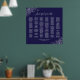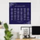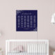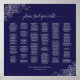 This beautiful wedding seating chart features pale gray text on a navy blue background with seating assignments for 200-240 guests. It features a simple yet stylish and elegant design with ornate decorative faux foil silver filigree in the corners. The title is written in fancy script calligraphy and reads: Please find your table.