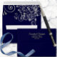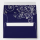 This beautiful wedding envelope is features a dark navy blue background with silver grey floral curls and swirls on the inside flap. There is a printed return address on the back flap in fancy script lettering. The design is understated and simple, yet classic, chic and ornate. Perfect way to make your wedding invitations all the more special.