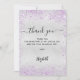 A faux silver looking background, decorated faux lavender, violet glitter. Large hand lettered script and the text: Thank You. Personalise and add your thank you note and name.