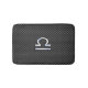 A silver chrome like Libra Zodiac symbol on a charcoal carbon fibre style design texture print background. A modern urban racy design for a great custom birthday gift idea.