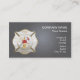 Silver maltese cross firefighting symbol with ladder, axe, and nozzle on a brushed grey background.