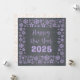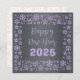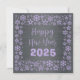 Square wish card Happy New Year written in English in mauve font with a lot of golden stars on a silver background - editable text and background