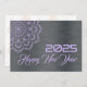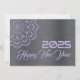 Greeting wish card Happy New Year written in English in mauve font with mandala on a silver background - editable text and background