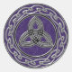 A Silver Metallic Celtic Wheel made of of Knots and a Trinity or Triquetra representing body, mind and spirit. On a sparkling purple background.