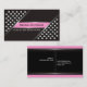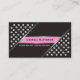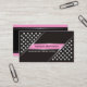 Silver metallic studs and diagonal stripes black pink business cards, featuring two triangles covered with metallic studs on two corners of the card, diagonal silver stripes and a pink band in the centre with your name. Black background.