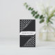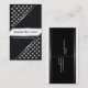 Silver metallic studs and diagonal stripes black white business cards, featuring two triangles covered with metallic studs on two corners of the card, diagonal silver stripes and a white band in the centre with your name. Black background.