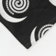 Graded, silvery crescent moon accompanied by a spiral pinwheel of light, on a black night sky background
