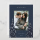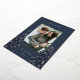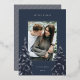 A modern and elegant Christmas holiday card design featuring a single vertical photo on a navy blue background. Two tall pine trees frame your photo, adorned with silver foil detailing. Personalise with your custom holiday greeting, family name and the year.
