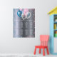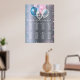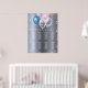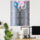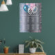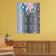 A faux silver looking background. Decorated with blue, pink and white balloons and blue and pink faux sparkles. Personalise and add the name(s) and your guests names. For 8 tables. White text.
