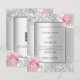 Faux silver looking background decorated with blush pink and white florals, flowers and faux silver glitter, sparkles. Personalise and add your names and wedding details. Black letters.