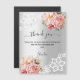 A faux silver looking background. Decorated with pink roses, flowers and white lace. Large hand lettered script with swashes and the text: Thank You. Personalise and add thank you note and name.