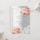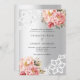For an elegant and romantic wedding. A faux silver looking background decorated with pink and rose gold florals, roses and white lace. Personalise and add your names and details.