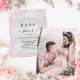 A modern, elegant baby shower, celebrating a baby girl. Faux silver looking background decorated with pink faux glitter. Personalise and add a name and party details. Black coloured letters.