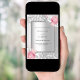Faux silver looking background decorated with blush pink and white florals, flowers and faux silver glitter, sparkles. Personalise and add your names and party details. Black letters.