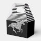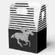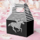 Gable party favour boxes feature a racehorse in faux silver glitter on black and white stripes at the top and black at the bottom - change the background colours to anything! Great for Derby party, Derby bridal shower, birthday party, retirement party and more. MATCHING items in our collection.