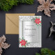 Faux silver looking background decorated with red poinsettias, green leaves, confetti. Personalise and add your party details. Black letters.