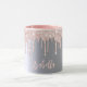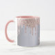 An elegant, girly and glam mug. Faux rose gold drip, paint drip.  Chic faux silver looking background.  Template for your name written with a hand lettered style script.  Rose gold coloured letters.