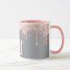 An elegant, girly and glam mug. Rose gold and pink faux glitter drip, paint dripping look. Chic faux silver metallic looking background. Personalise and add your monogram initials, letters. Rose gold coloured letters.