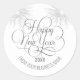 Silver script Happy New Year sticker with your editable personalised business name, personal name, or message. Perfect for a New Year's party or a New Year's gift from your business. Firework illustrations add a festive touch to the new year stickers.