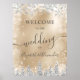 Welcome guests to your winter wedding with this elegant sign featuring faux silver glitter shimmering snowflakes and a forest of frosted pine trees. Set against a faux metallic gold foil background, the design exudes a magical winter wonderland ambiance. Perfect for a Christmas or winter wedding, this sign sets the tone for a festive and romantic celebration.