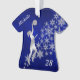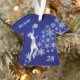 This Holiday ornament features a silver silhouette female basketball player in front of a spray of ornate silver snowflakes. The image is placed on a gradient deep blue background. Your custom text is in silver on the left sleeve, and a second field is at the lower right. The back of the ornament has the same blue background and snowflakes, and additional text fields for you to customise. Perfect for the basketball player or fan.