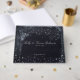 A sumptuous black watercolor night sky amidst sparkling silver stars cascading onto classic English script calligraphy with a splattering of shimmering silver ink spots.