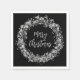 Twinkling silver stars, circles and dots surround the words "Merry Christmas" on black holiday paper napkins. MATCHING items in our store.