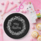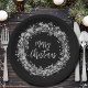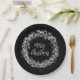 Twinkling silver stars, circles and dots surround the words "Merry Christmas" on black holiday paper plates. MATCHING items in our store.