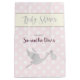 Featuring silver colour Baby Shower Calligraphy script and a silver colour stork carrying a baby with white polka dots and a gentle pink background.