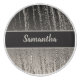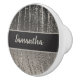 This drawer pull offers a cute and personalised way to adorn a nursery dresser or closet door. Long vertical stripes of shimmery liquid silver add an elegant pattern to this drawer pull featuring a dark grey banner and the baby's name. Quickly and easily personalise.