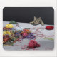 Silver tabby cat climbing over edge of table mouse pad
