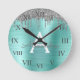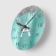 Silver Teal Glitter Brushed Metal Monogram Name Round Clock