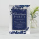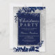 A modern, chic and elegant silver typography Floral navy blue watercolor Christmas party invitation with hand painted blue watercolor leaf foliage on a chic grey gradient with white snow and snowflakes..