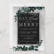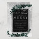 Eat, drink and be merry! A modern, chic and elegant silver typography Floral green watercolor Christmas party invitation with hand painted green watercolor leaf foliage on a chic grey gradient with white snow and snowflakes. Perfect for Christmas or weddings.