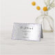A modern and elegant. A faux silver looking background decorated with violet, lavender coloured glitter, sparkles. Personalise and your names and the wedding date. Add your guests names and their table number by hand.