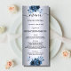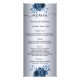 An elegant, modern and romantic wedding menu card. Faux silver metallic looking background, decorated with watercolored flowers in shades of blue. Templates for your names, date and the wedding menu. Black coloured letters. Back: Faux silver looking background and florals.